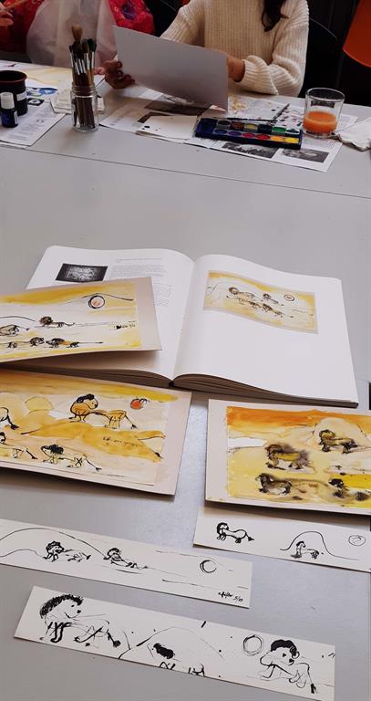 A3-Mappe für die Bilder und langärmeligen Malkittel (z. B. altes Erwachsenen-Hemd) mitbringen, damit die Kleidung vor den Farben geschützt ist.